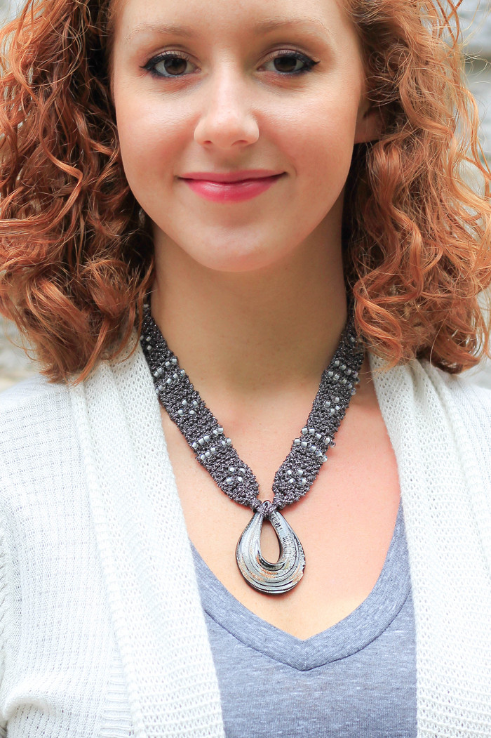 Inspired by my visit to the Spanish city that bears its name, the Granada necklace is a stylish captivating design. It is easily knit with contrasting accents of glistening glass beads, and bears a beautifully hand-crafted Murano style glass pendant. A versatile piece of knit jewelry you'll love to wear year around!