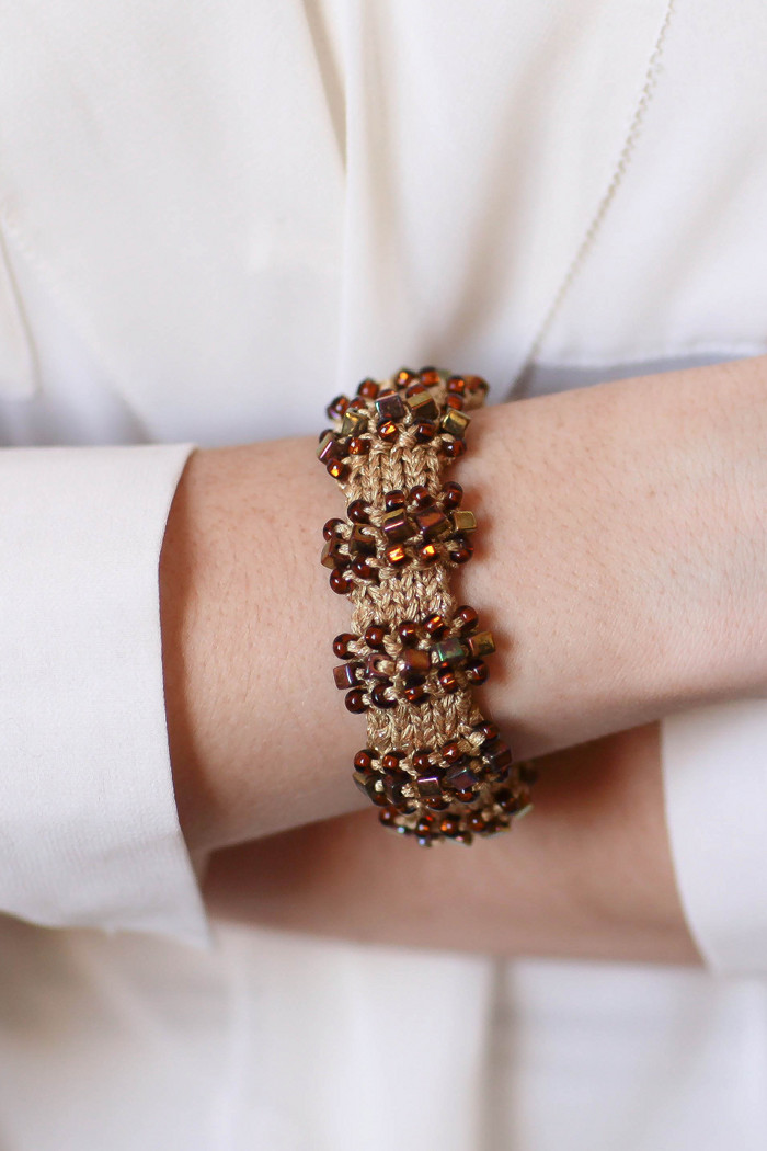 The Toledo Bracelet is a stunning knitted bracelet that uses garter stitch and stockinette stitch to create its 3-dimensional texture. Adorned with bands of glistening cubic glass beads surrounded by round beads, the Toledo Bracelet can be worn with formal or casual attire. Inspired by my visit to the beautiful Spanish city that bears its name, this bracelet can be worn alone, or paired with the matching Toledo Necklace.