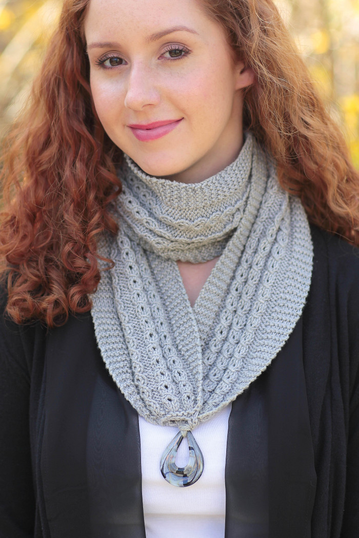 The Diana Scarf is an eye catching design. The scarf is fastened together by a beautifully hand-crafted Murano style glass pendant that passes through a knit loop. It can also be worn as a fashionable cowl.