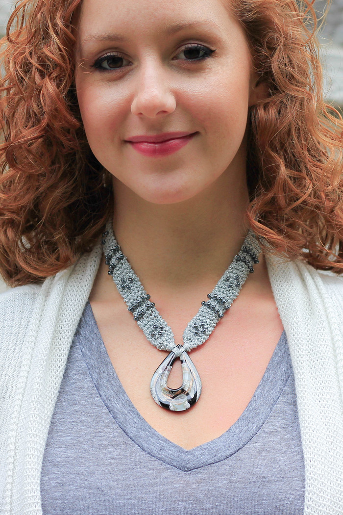 Inspired by my visit to the Spanish city that bears its name, the Granada necklace is a stylish captivating design. It has a beautifully hand-crafted Murano style glass pendant. A versatile piece of knit jewelry you'll love to wear year around!