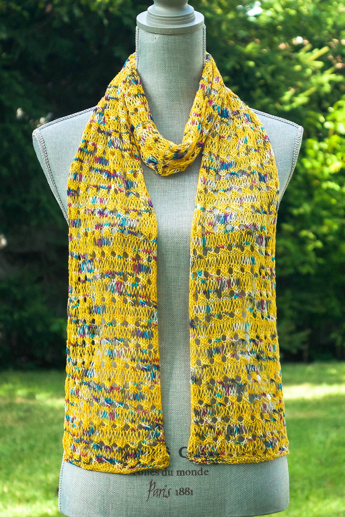 The combination of eyelet and drop stitches make this scarf a light and airy design with a lovely drape. The blend of Silk and Merino yarn feels so soft around your neck yet it gives you a bit of warmth to wear it on cooler days.