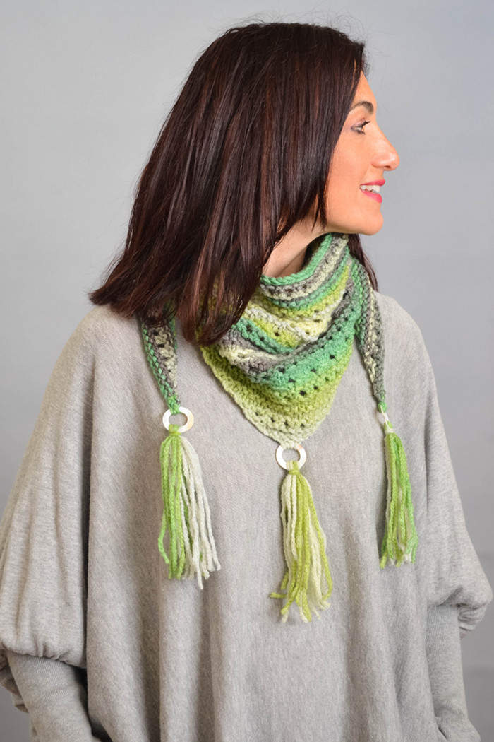 The triangular scarf is worked in luxurious Ella Rae Seasons Yarn with knit, purl, and eyelet stitches, and accented with natural pearly shell rings and fringes.
